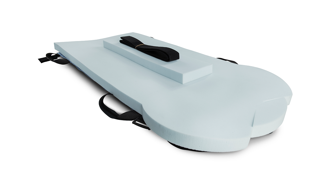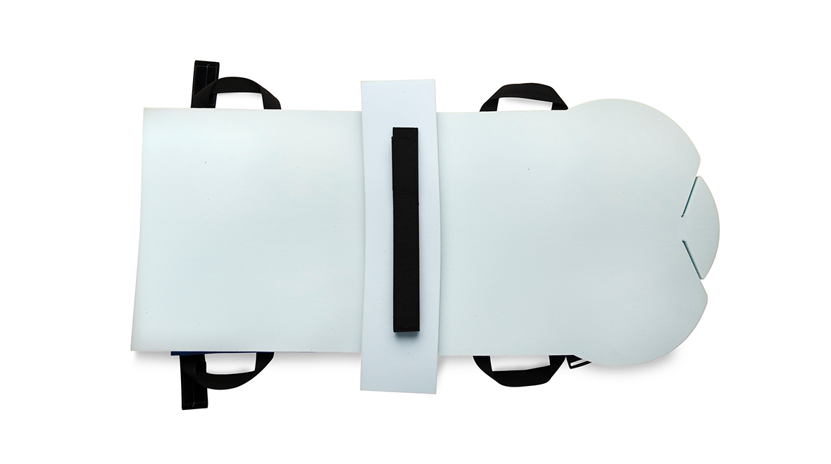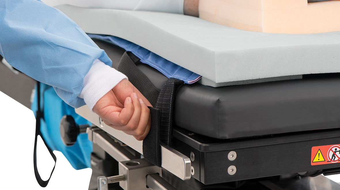 When handles are lifted, the smooth center sled remains in contact with the surface for easy patient set up and repositioning. The reinforced backing allows for patient weight of 450 lbs (207 kg)* to be transferred without tearing the soft foam. When the Hana Distraction Pad is secured to the table, three (3) grip strips keep the patient securely in place when traction forces are applied to the legs.