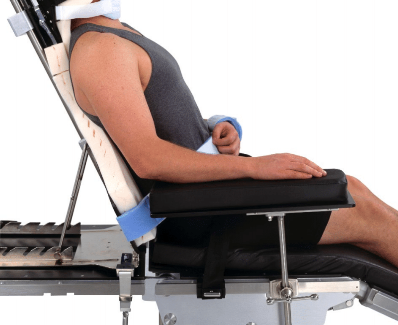 Attaches to a general surgery table and maintains patients in a beach chair position for shoulder procedures.