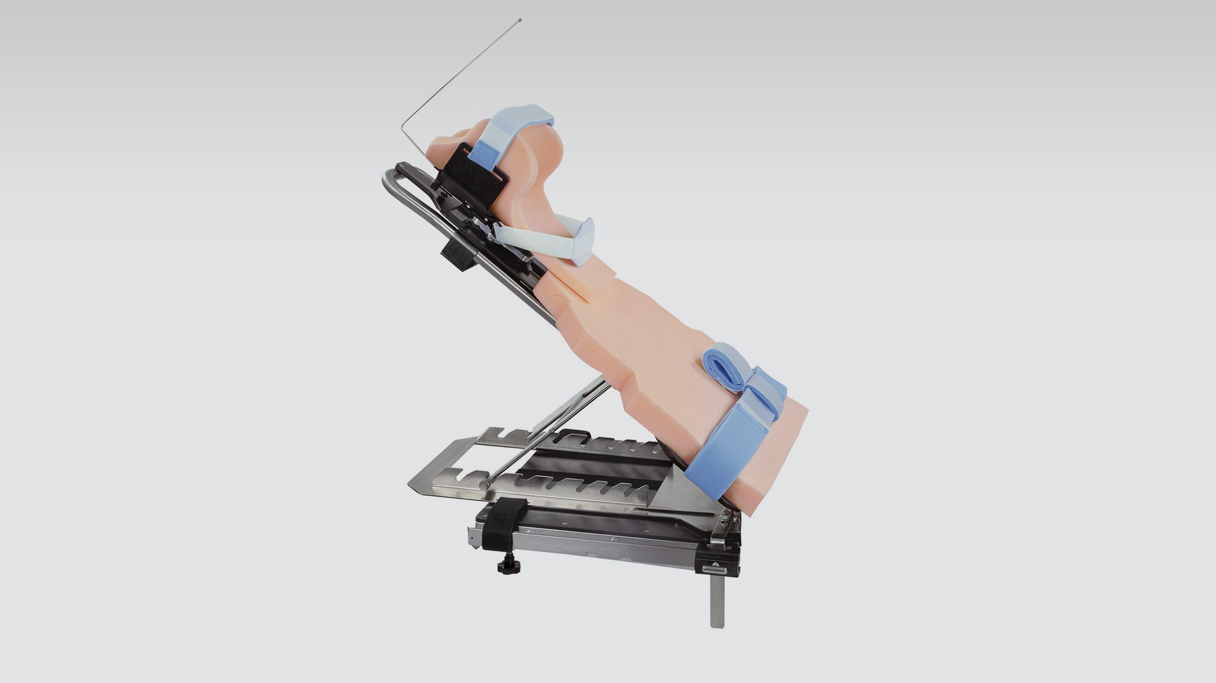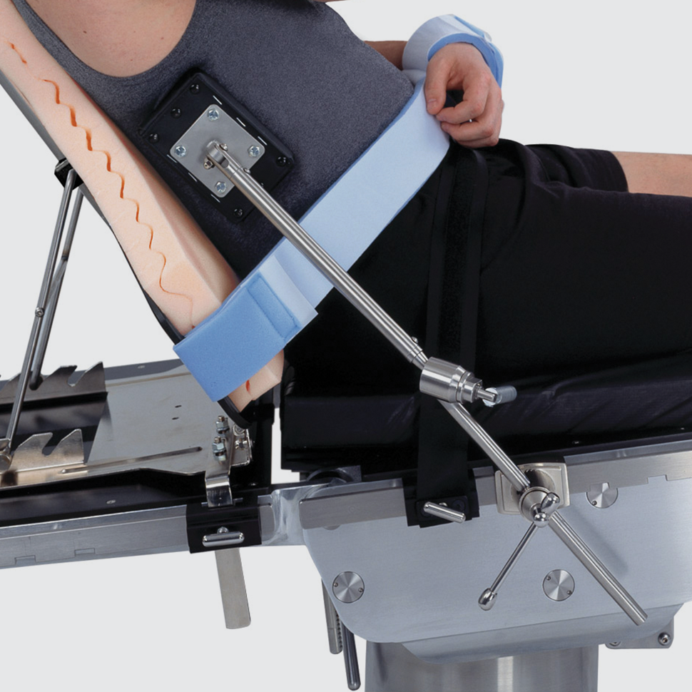 The Ultra Shoulder Positioner (USP) keeps patients stable and secure while providing excellent access and visibility during a range of shoulder procedures. This device attaches conveniently to any surgical table, makes it easy to position the patient, and provides unobstructed access to the site. The radiolucent backrest has a low contour for easy shoulder access from both front and back. Headrest wings provide secure head support and can retract for obstruction-free space around the patient’s head for the anesthetist. The Ultra Shoulder Positioner sets up in just minutes.